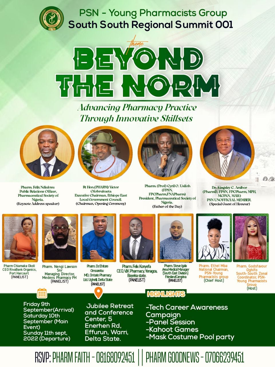 PSN-YPG South-South Presents Its 1st Regional Summit scheduled to hold from the 9th-11th of September 2022 in Warri, Delta State with the theme: BEYOND THE NORM: ADVANCING PHARMACY THROUGH INNOVATIVE SKILLSET.
